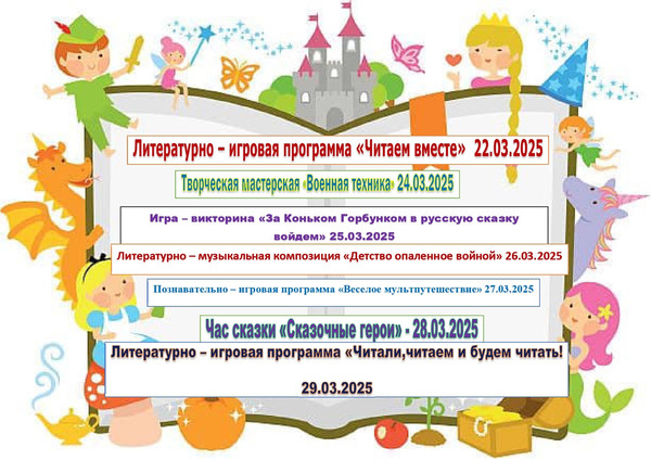| Уважаемые читатели! С радостью сообщаем вам, что ежегодная всероссийская акция «Неделя детской книги» в этом году пройдет 22-30 марта под лозунгом «История с продолжением» и будет посвящена 80-летию Победы в Великой Отечественной войне и Году защитника Отечества. Это замечательное событие, посвященное литературе для детей и подростков, станет настоящим праздником для юных читателей и их родителей. В течение недели мы подготовили множество интересных мероприятий, которые помогут погрузиться в мир книг и вдохновят на творчество. Каждый день в библиотеке будут проходить чтения популярных детских и юношеских произведений. Приглашаем детей и их родителей присоединиться к этому увлекательному процессу! Начало мероприятий в 15.00. | |